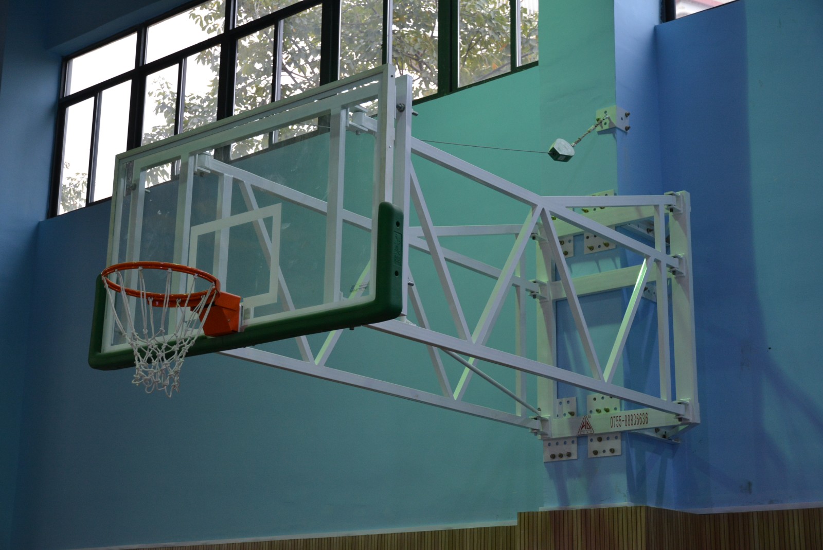 箱体:篮球架的箱体是整个篮球架的重心,里面有一个配重盒。根据篮球架臂长确定安装位置。后部面积越大篮球架的伸臂就越长,即箱体与底线的距离,场地的宽度应足够安装。